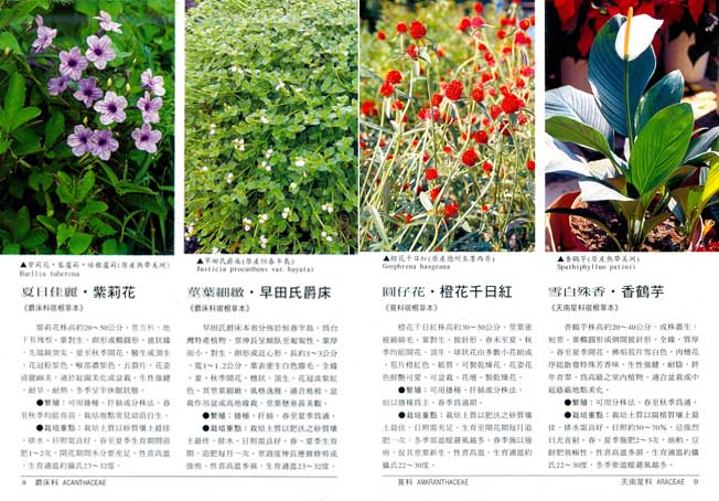 內容包括中名、別名、科名、學名、原產地、最新繁殖方法、栽培重點、花曆,花卉播種注意事項等。花卉種類按科名的英文字母順序配列,查閱方便。