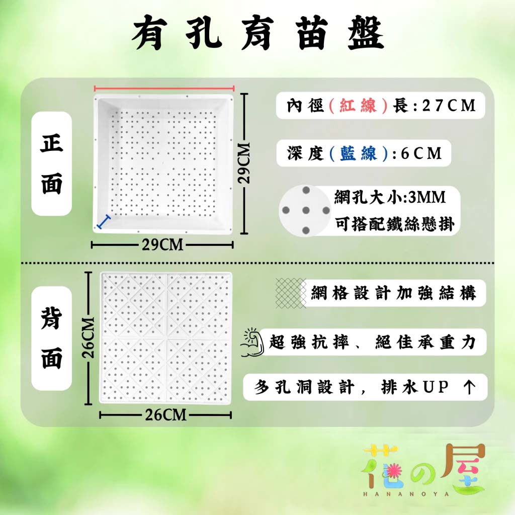 "3mm大孔洞、孔洞分佈均勻,迅速排除多餘澆灌水份"