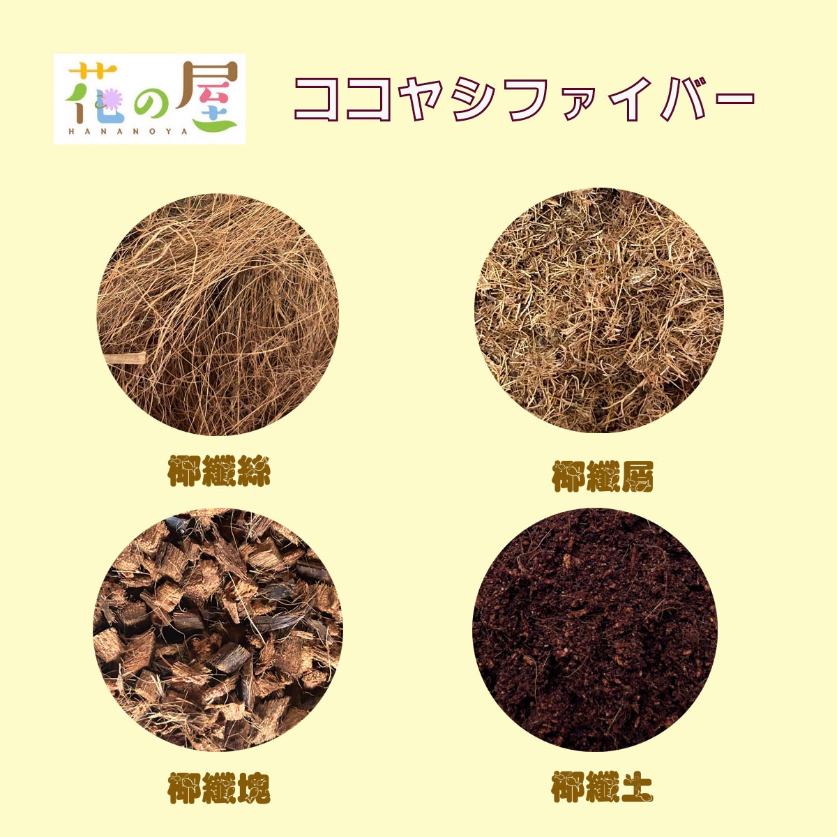 椰纖絲:椰子纖維自然形成,韌性極強且不易斷裂,腐化速度較慢,可長期使用,常用於盆栽土壤表面裝飾,亦可防止土壤飛濺,與雜草滋長,質輕成本低,用途極為廣泛。