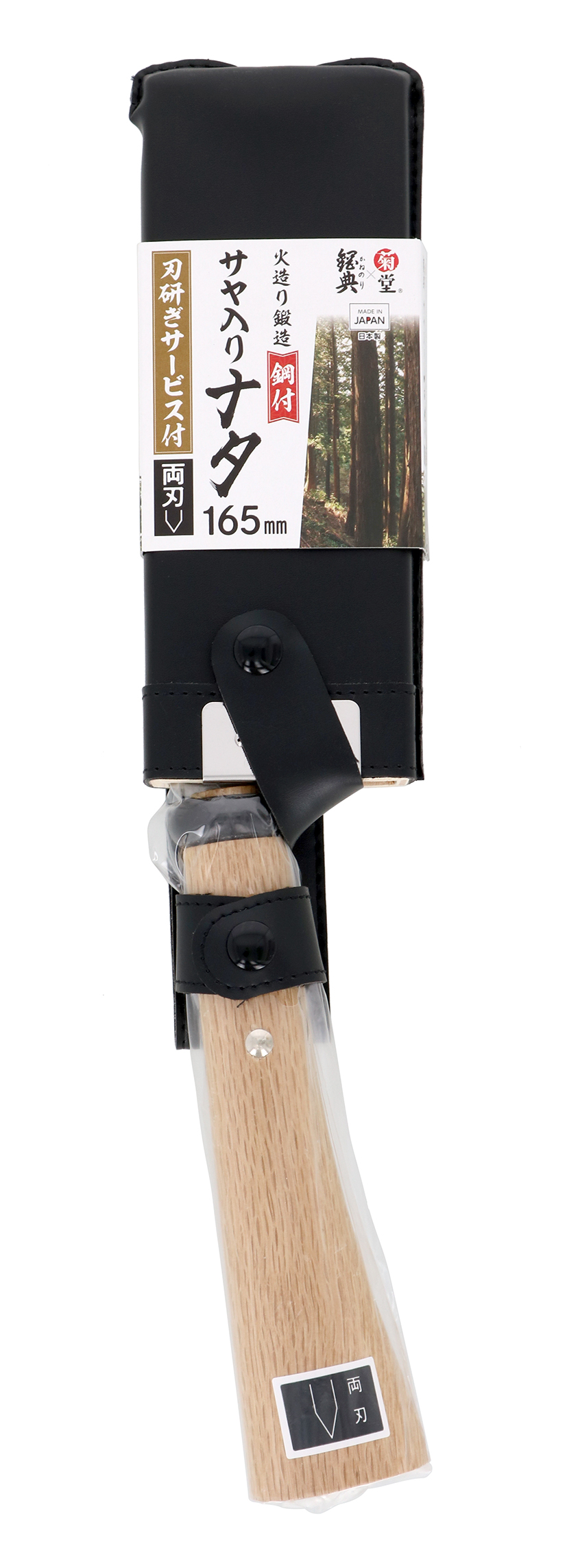 本砍刀刃長165mm,刃部使用特製鋼鍛造,本尺適合居家露營時砍筏樹木、木材、竹子使用。附木製刀殼,收納方便。