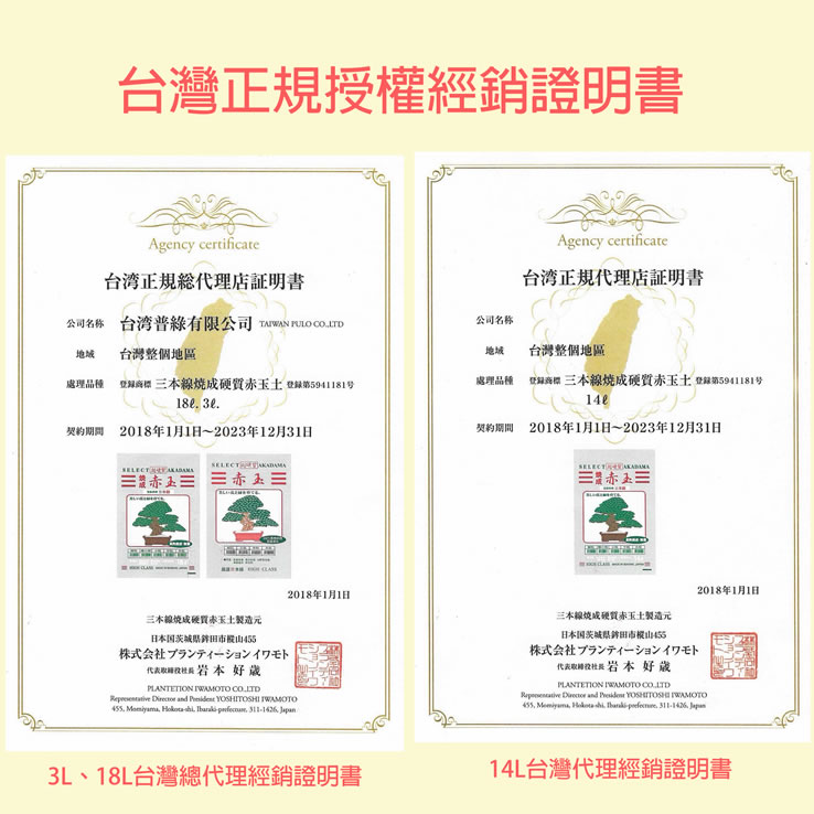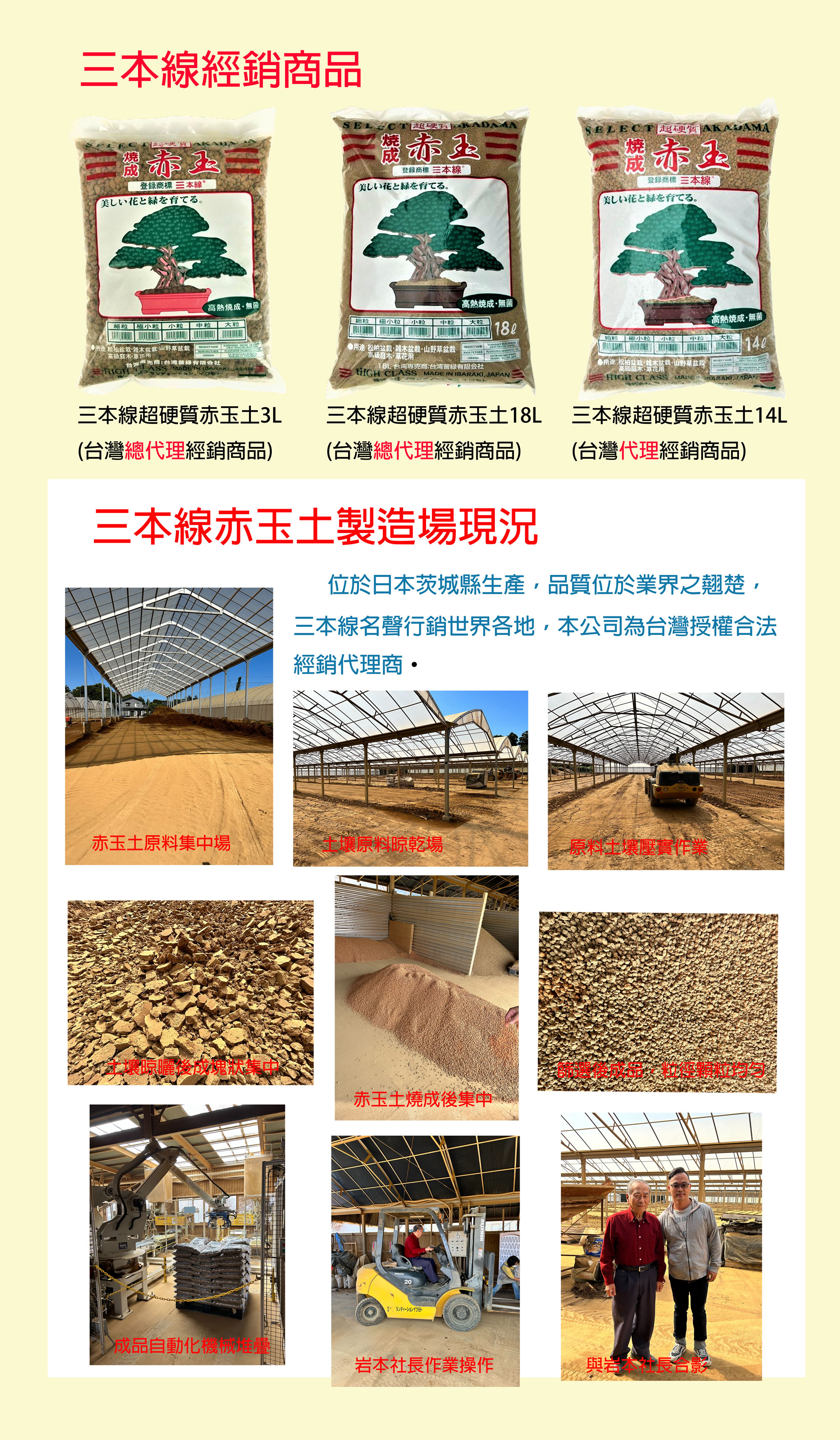 為業界品質稱冠之最知名赤玉土,本公司為三本線品牌台灣合法代理商,國內唯一經銷包括3公升、14公升、18公升三種不同包裝之三本線赤玉土,觀迎業界批發與零售。