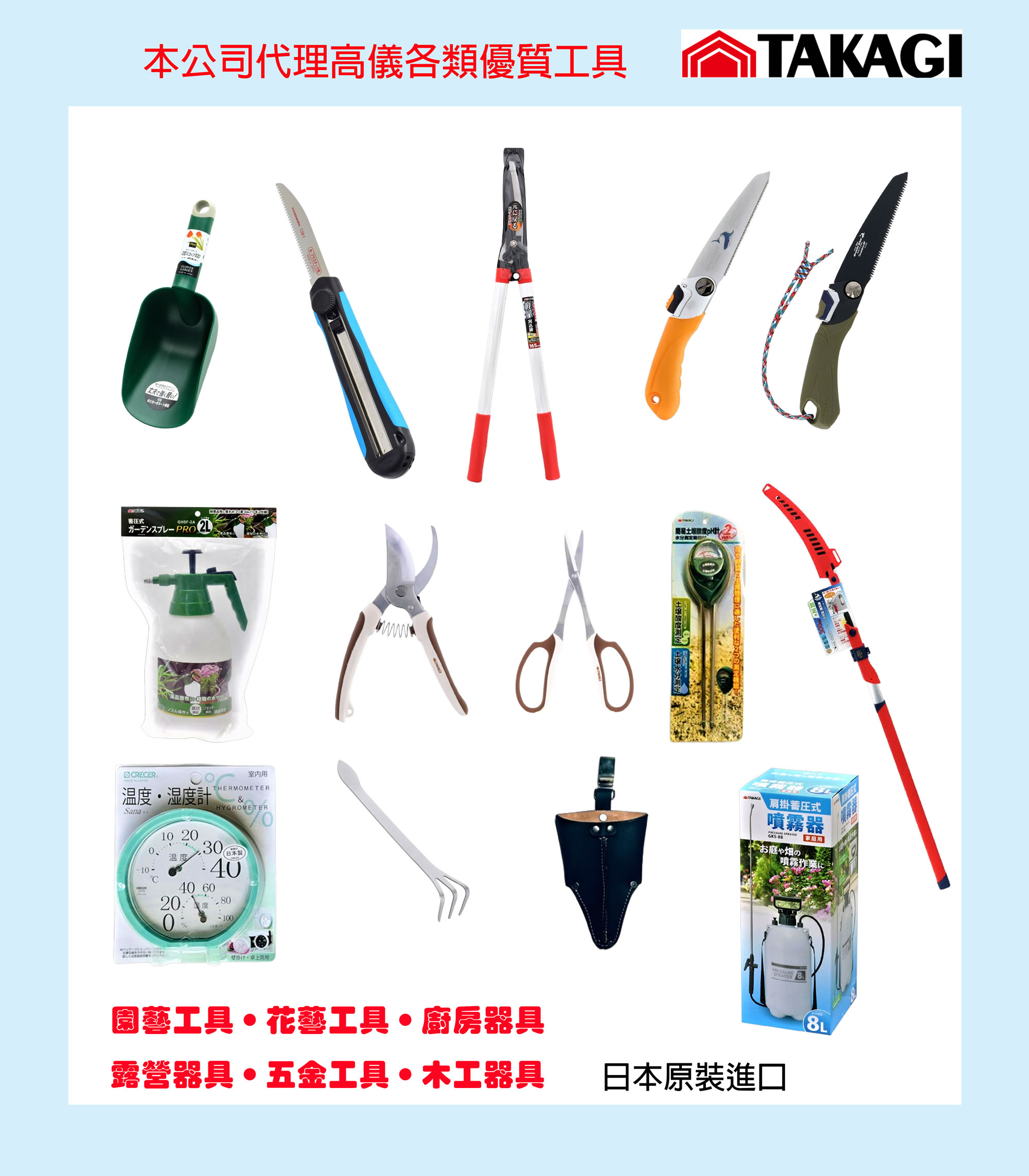 創業於1866年,總社位於日本新瀉縣,為日本知名工具生產企業,2023年營業額高達363億日圓,社員人數也高達700多名,生產經銷日本各項優質園藝工具、家庭工具、木工工具、建築工具、電動五金工具等,經銷全世界各國,本公司於2015年起,為高儀在台灣授權之合法經銷商。
