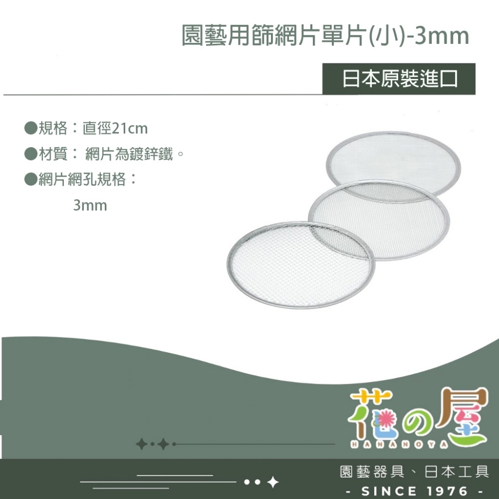 日本原裝進口園藝專用篩網,共分為3中規格,分別為直徑37公分、30公分、21公分,不銹鋼材質,持久耐用,分別附3種規格濾網,可按自己喜好篩選土壤使用。