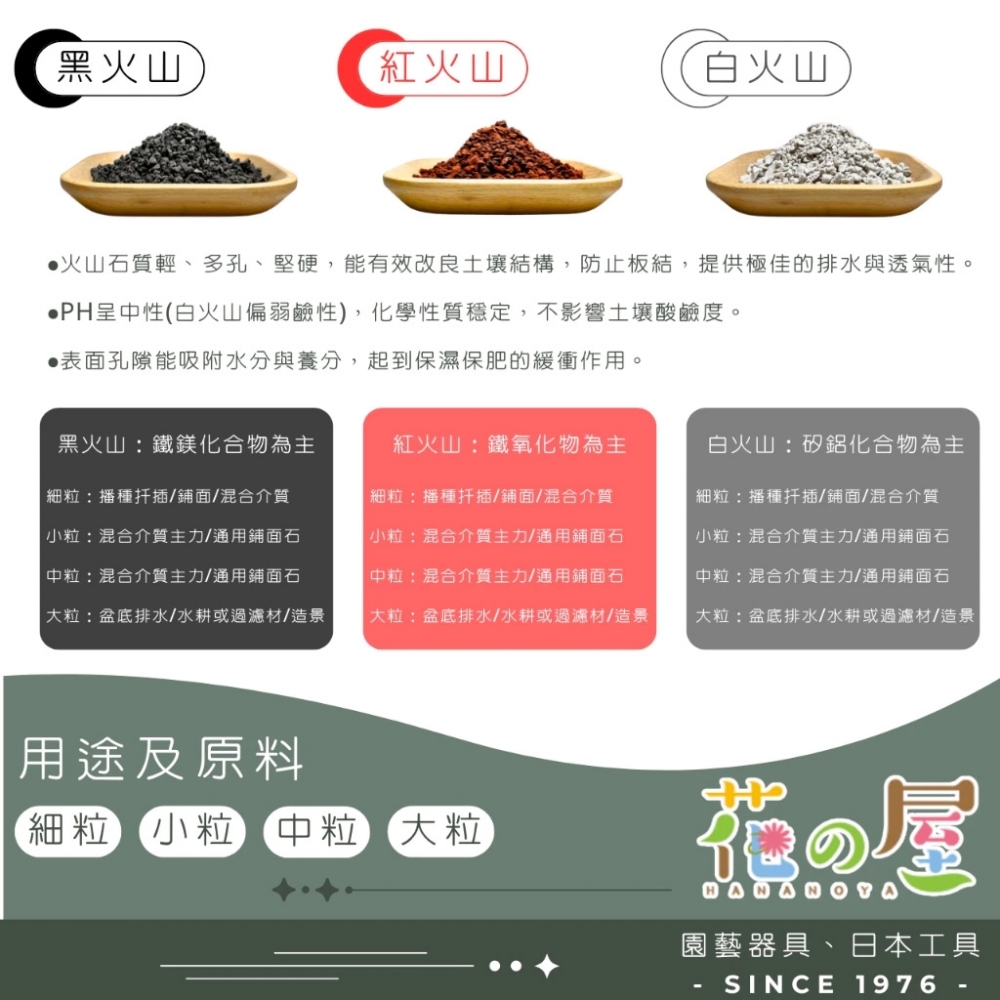 又稱浮石、蘭石,是目前世界上最大的出口產地,規模及品質相對於其他國家穩定許多;質地堅硬不易粉碎、崩解、不結塊、耐久佳,具有多孔隙結構,吸附力非常的強,水引導性佳,本身適度保水保肥力,顆粒間排水優良、不易積水的特性,是非常優良的栽培介質之一。 材質:開採自土耳其天然火山岩 成分:二氧化矽52~75%、鋁11~17%、鐵0.5~5%、鈣1~8%、鎂0.5~3%、鈉+鉀3~9%、鈦<1;孔隙度45~90%