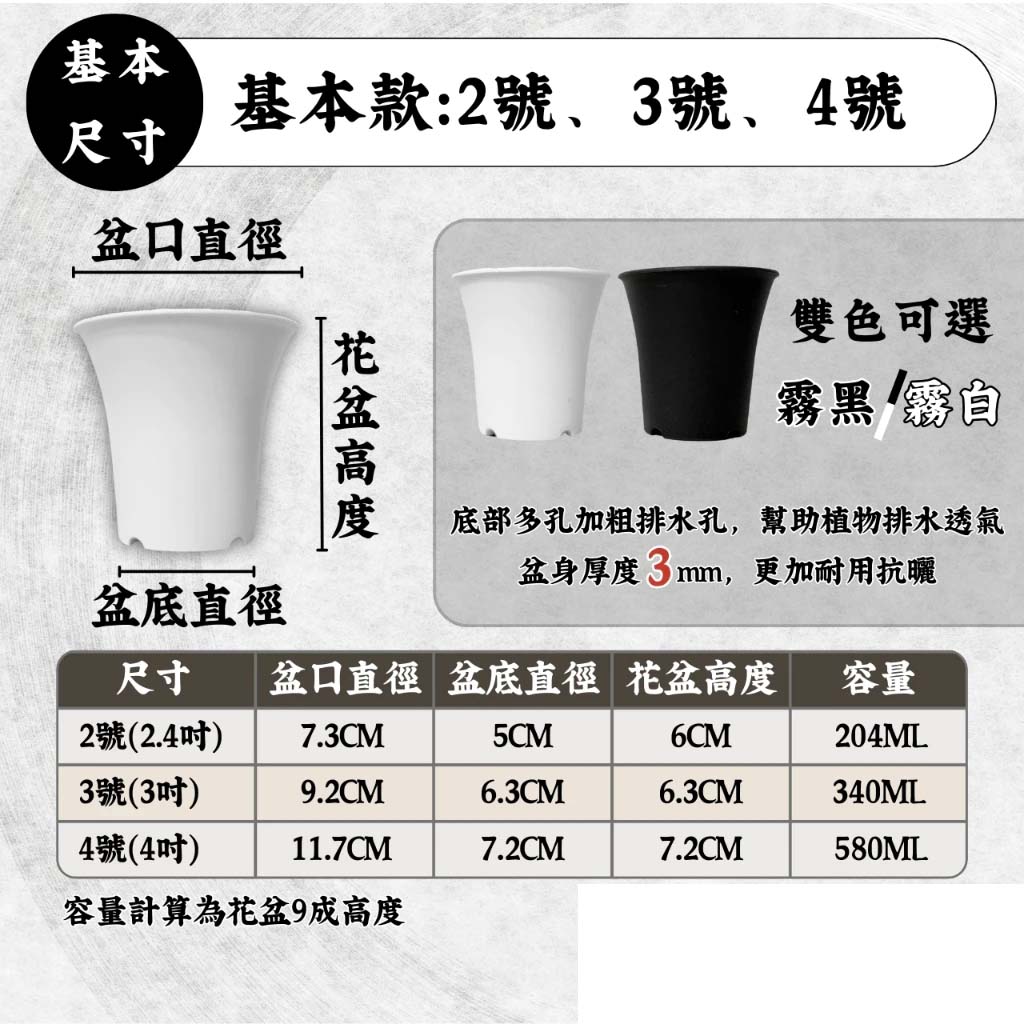 多肉丸盆(基本款)2.4吋/3吋/4吋-黑色、白色 多肉丸盆特色:是專門為仙人掌和多肉植物設計的盆具,特點包括:高度足夠(還有加高款喔!!)排水良好、盆口圓滑不易割傷植物、這些特色有助於多肉植物的健康生長 ●超商取貨數量限制