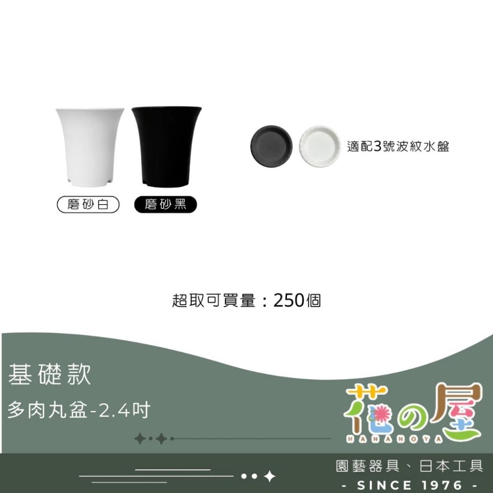 多肉丸盆(基本款)2.4吋/3吋/4吋-黑色、白色 多肉丸盆特色:是專門為仙人掌和多肉植物設計的盆具,特點包括:高度足夠(還有加高款喔!!)排水良好、盆口圓滑不易割傷植物、這些特色有助於多肉植物的健康生長 ●超商取貨數量限制