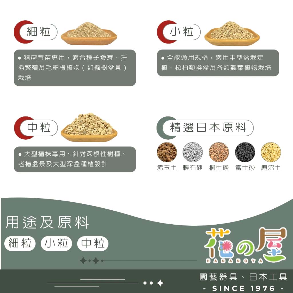 日本原包裝進口,為專為盆栽種植調製之高級土壤,由燒成赤玉土、燒成輕石、硬質鹿沼土、富士砂、桐生砂等高級栽培介質按最佳比例調製而成,種植後土壤不易粉碎,能使植物根部最佳的健全發育,通氣性、排水性、保水性皆良好,是盆景與盆栽根部發育必備之土壤。最適合松樹類、柏樹類、木本植物等盆景與盆栽使用。