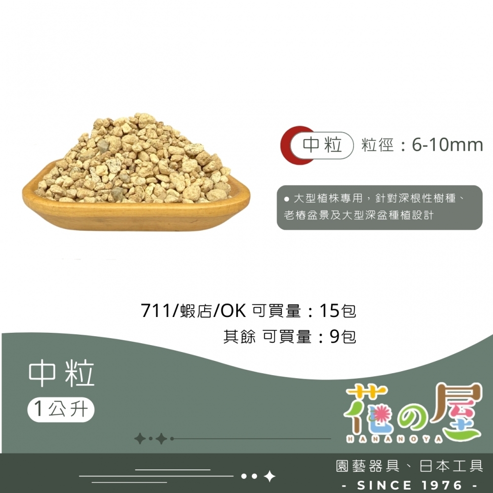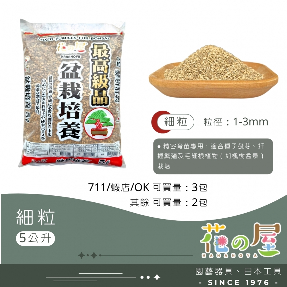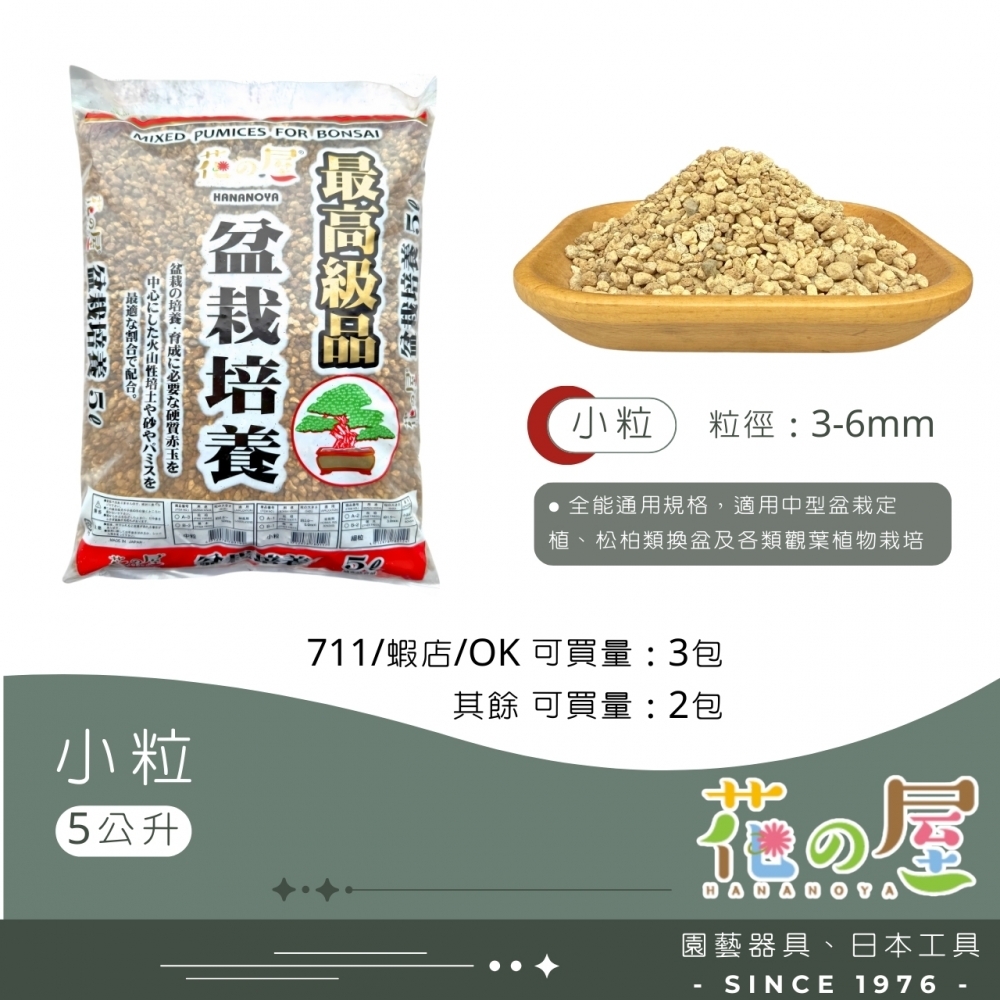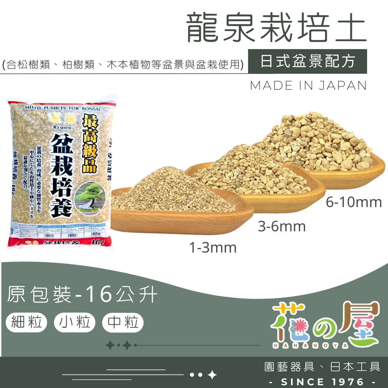 日本原包裝進口,為專為盆栽種植調製之高級土壤,由燒成赤玉土、燒成輕石、硬質鹿沼土、富士砂、桐生砂等高級栽培介質按最佳比例調製而成,種植後土壤不易粉碎,能使植物根部最佳的健全發育,通氣性、排水性、保水性皆良好,是盆景與盆栽根部發育必備之土壤。最適合松樹類、柏樹類、木本植物等盆景與盆栽使用。