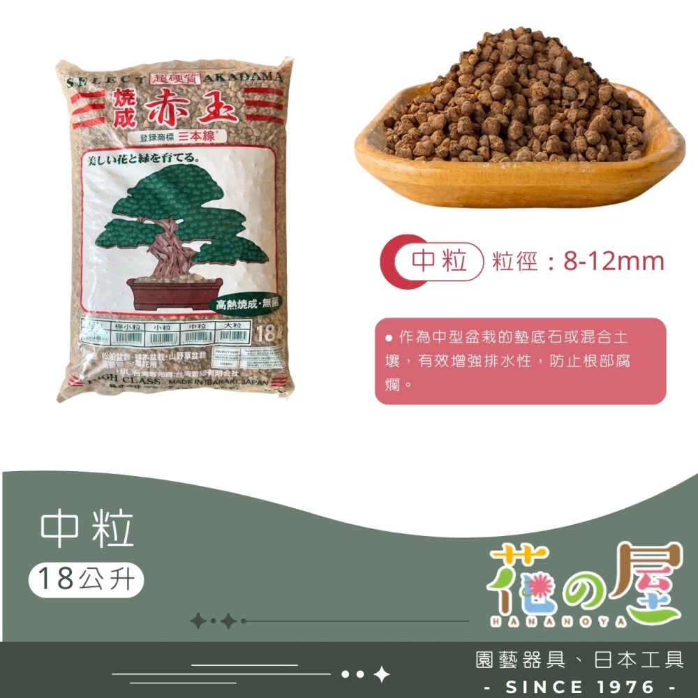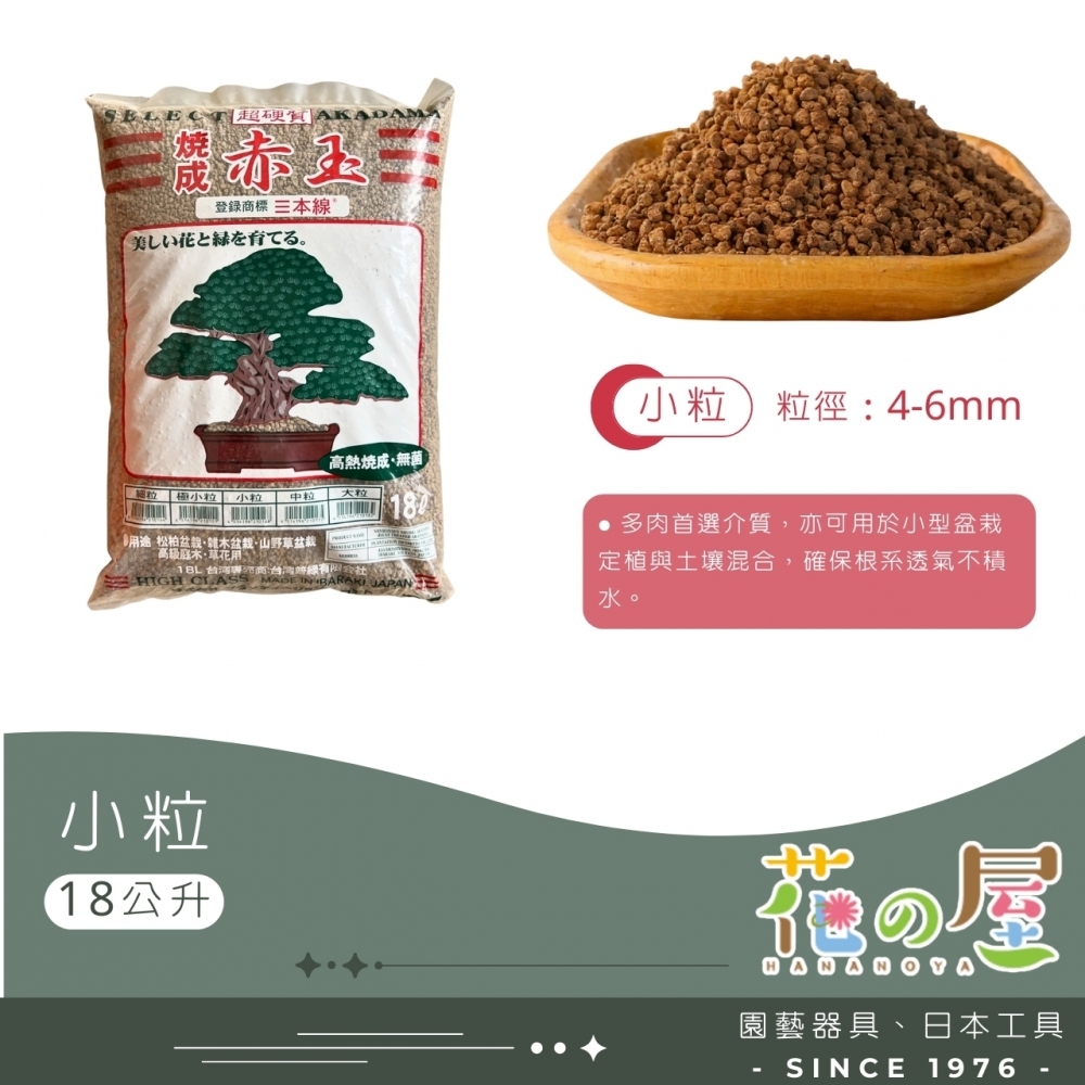 日本原包裝進口,為高級超硬質赤玉土,高溫250度C殺菌,為赤玉土中最高等級,適合小品盆景、盆栽、一般草花、觀葉植物、木本植物使用。