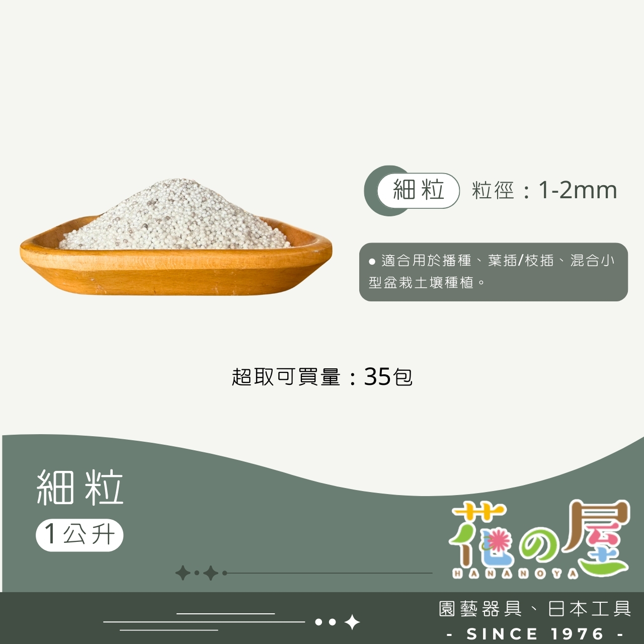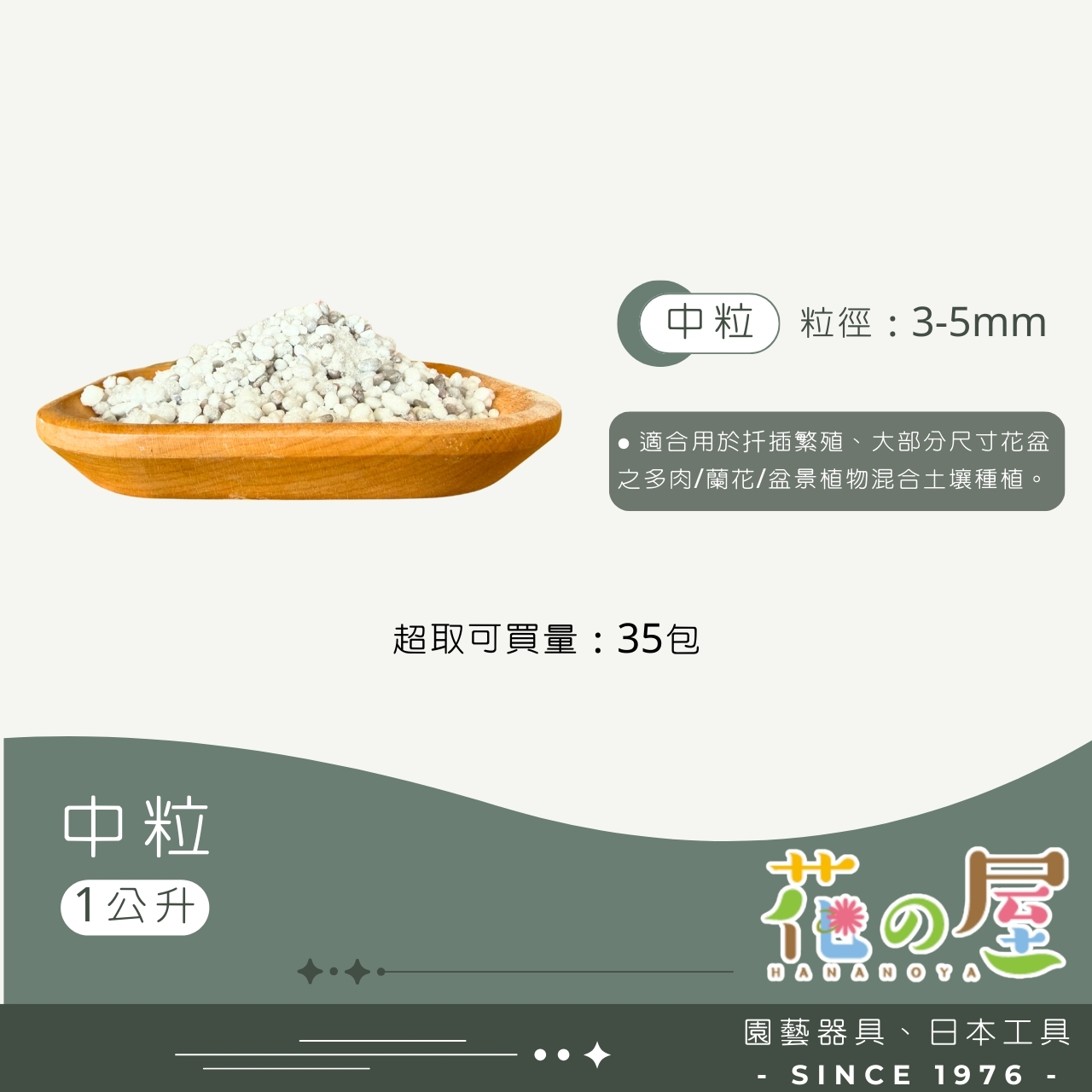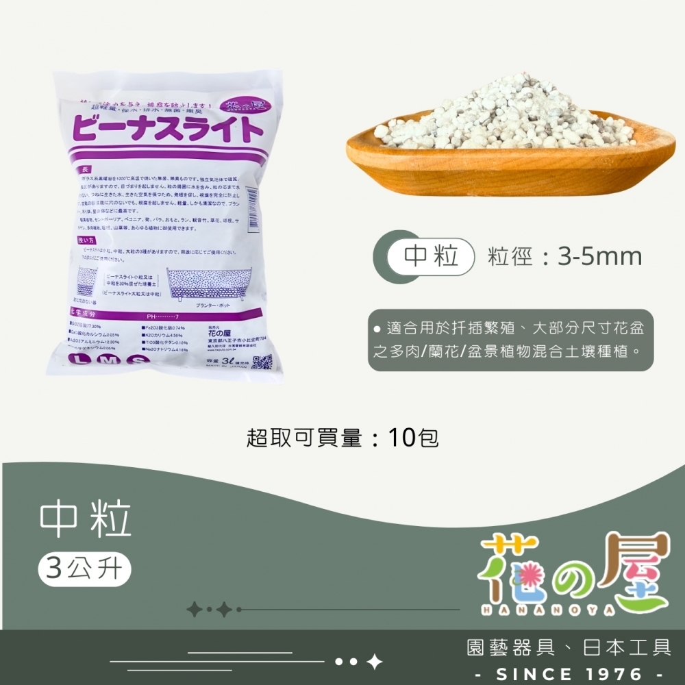 日本製造之土壤改良材,為黑曜石高溫製成,質量非常輕,乾淨、清潔,和珍珠石十分相似,顏色淺藍灰色,多用於與其他土壤混合使用,能有效改善排水與植物的根細發展,由於質輕,能有效降低培養土的重量於陽台上之花台與盆栽種植使用。