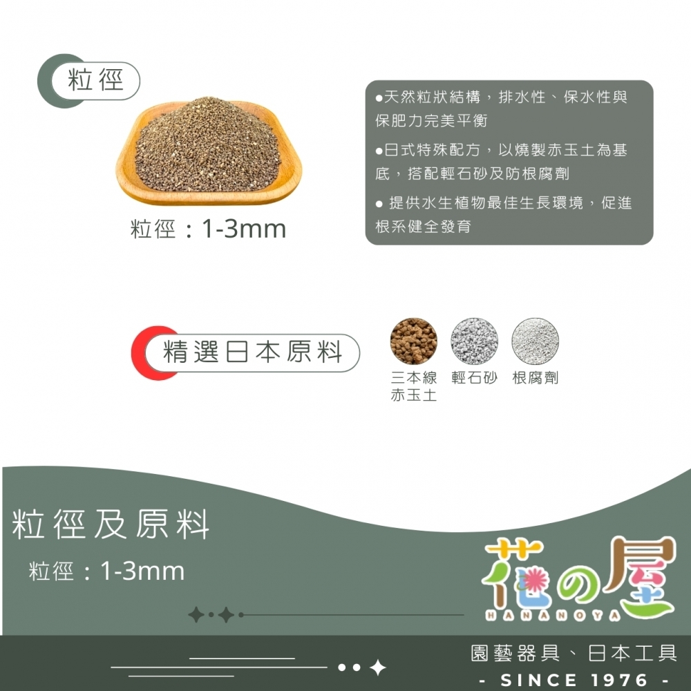 日本原裝進口之水生植物專用培養土,天然粒質土壤,排水性、保水性與保肥力俱佳,日本特殊配方調製而成,內含燒成三本線赤玉土為基底、輕石砂與防止根部腐劑是種植水生植物健全發育最佳選擇。