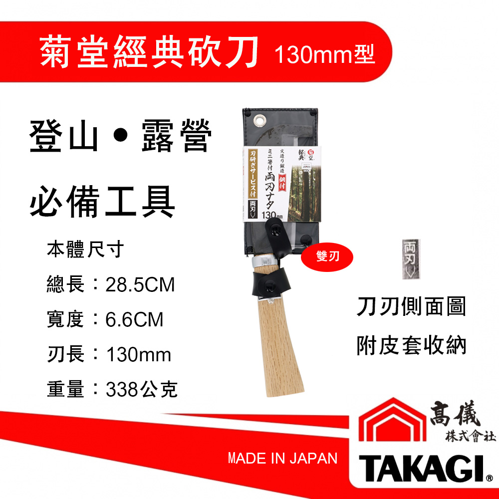 本砍刀刃長130mm,刃部使用特製鋼鍛造,本尺寸最迷你攜帶方便,適合居家火露營時砍筏樹木、木材、竹子之使用。刃部前端有保護設計,避免砍筏時損傷刀刃。
